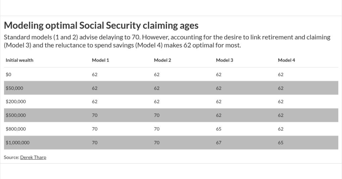 “The observation that claiming at 62 is optimal under Model 4 for wealth levels encompassing over 90% of American households does not imply that 90% of Americans ought to claim at 62,” he wrote. “The results presented here apply to a hypothetical individual whose preferences precisely match every parameter specified in this analysis — including the specific degree of front-loaded consumption preferences, the exact magnitude of source-dependent utility and the assumption of a claim-retire linkage. In practice, preferences vary substantially across individuals.”