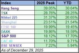 All nine indexes on our world markets watch list have posted gains through December 29, 2025. December Markets Watchlist World